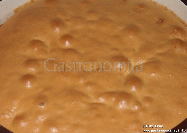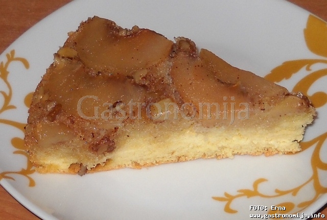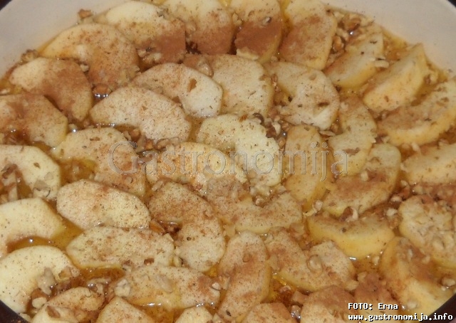 Puter istopite u okrugloj tepsiji, preko toga pospite jednu šolju šećera (da bude ravnomjerno raspoređen), zatim poredajte isječene jabuke. Jabuke pospite sitno sjeckanim orasima (možete dodati i bademe ili lješnike). Dodajte cimet.Odvojite bjelanca od žumanaca. Umutite bjelanca i šećer, pa dodajte (jedno po jedno) žumance. Zatim u smjesu dodajte i brašno, pomiješano sa praškom za pecivo. Sjedinite, pa sipajte preko jabuka. Pecite u pećnici, zagrijanoj na 200 C, oko 40 minuta.Pečen kolač izručite na tacnu, tako da jabuke budu gore.